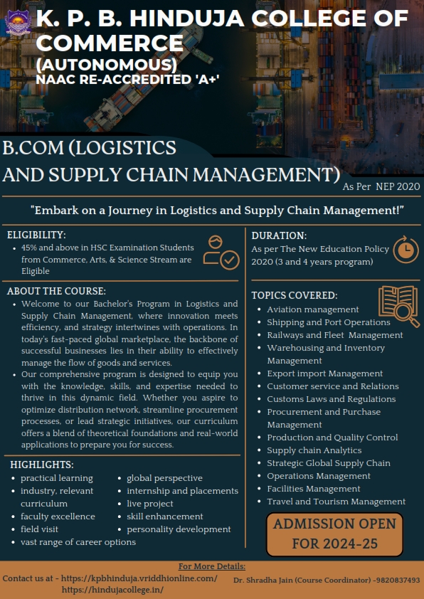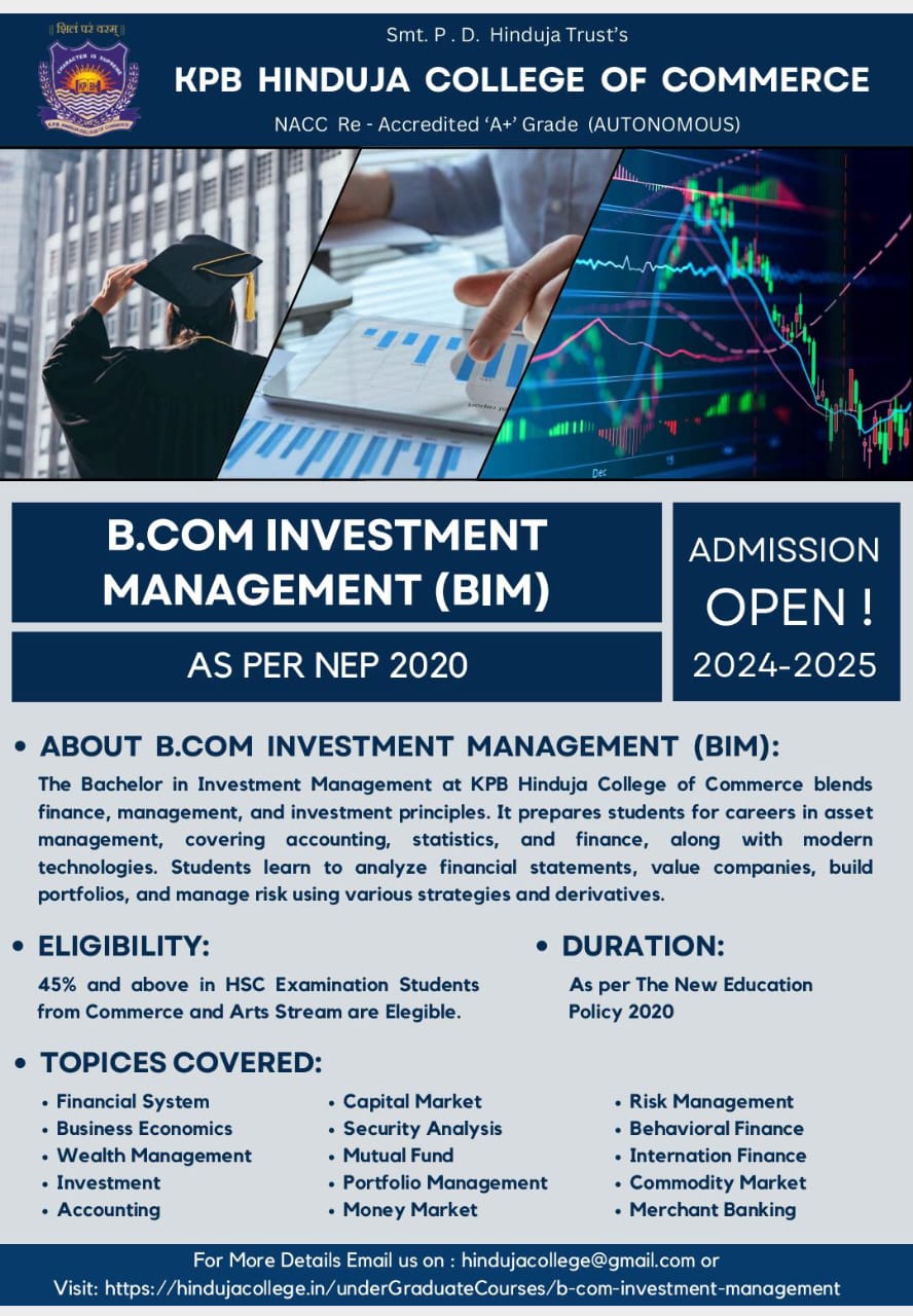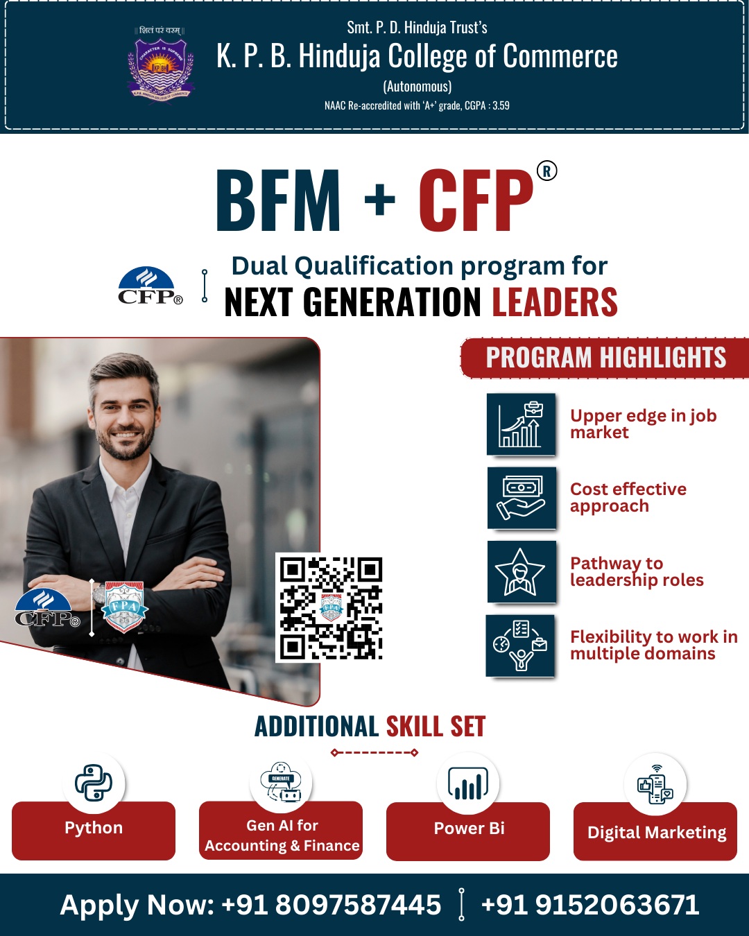 K.P.B. Hinduja College of Commerce, founded in 1974 by Late Shri Parmanand Deepchand Hinduja, is a premier academic institution in Mumbai with ISO 9001 certification and an A+ Grade from NAAC. Recognized as a College with Potential for Excellence by the UGC, it offers 15 academic programs from Junior College to Doctorate level. With over 6000 students and expert faculty, the college blends academic excellence with industry-oriented skill development courses like Cyber Law, Stock Market Operations, and Digital Marketing. Committed to holistic growth, it fosters social responsibility through NSS, NCC, and various co-curricular activities, shaping future leaders in commerce and industry.