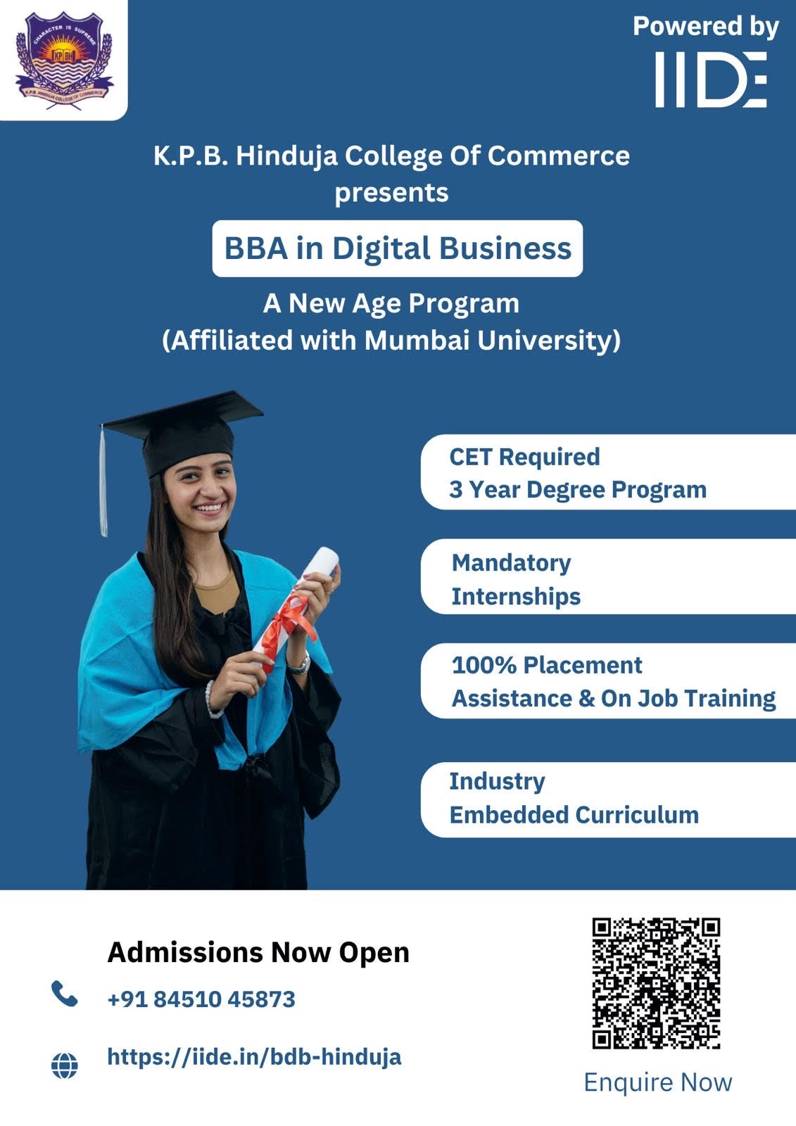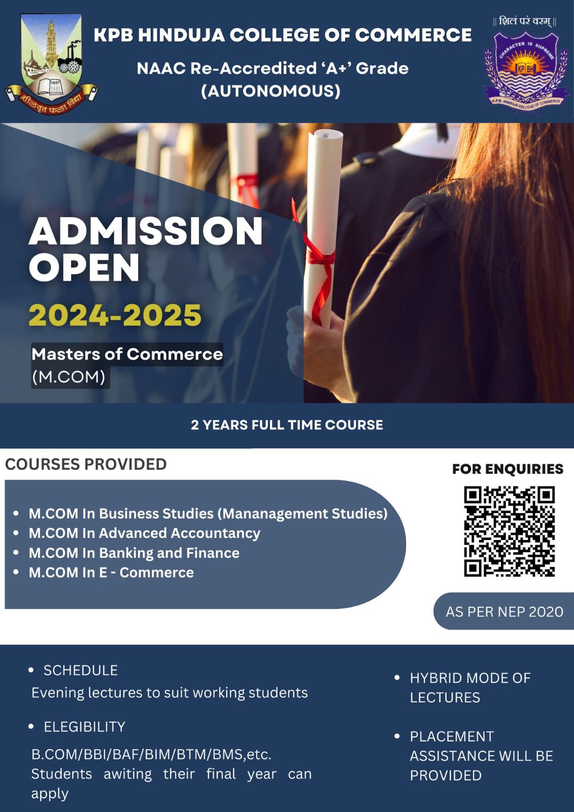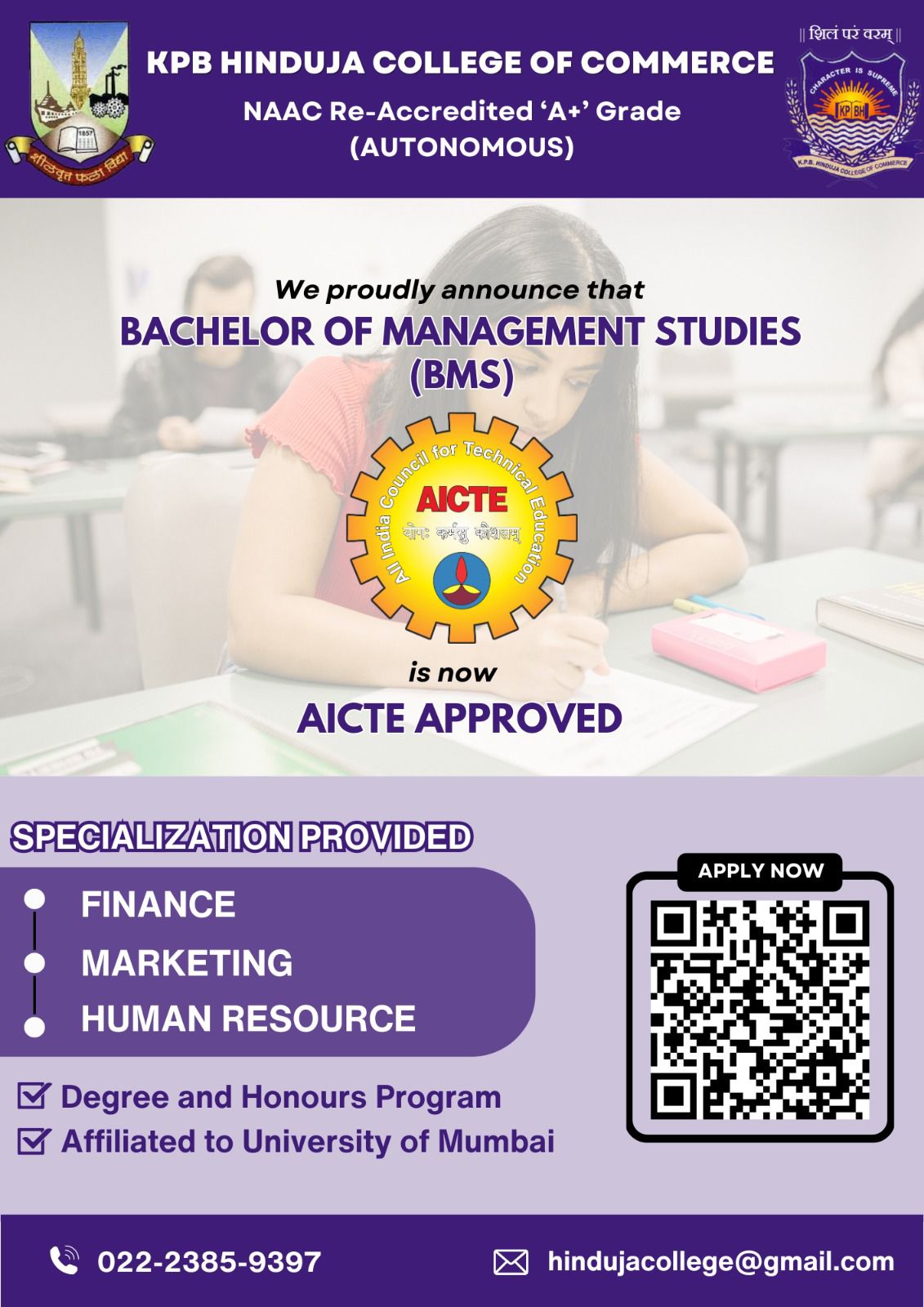 K.P.B. Hinduja College of Commerce, founded in 1974 by Late Shri Parmanand Deepchand Hinduja, is a premier academic institution in Mumbai with ISO 9001 certification and an A+ Grade from NAAC. Recognized as a College with Potential for Excellence by the UGC, it offers 15 academic programs from Junior College to Doctorate level. With over 6000 students and expert faculty, the college blends academic excellence with industry-oriented skill development courses like Cyber Law, Stock Market Operations, and Digital Marketing. Committed to holistic growth, it fosters social responsibility through NSS, NCC, and various co-curricular activities, shaping future leaders in commerce and industry.