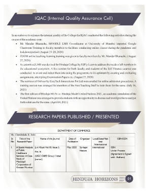 In an endeavor to enhance the internal quality of the College the IQAC conducted the following activities during the
