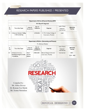 RESEARCH PAPERS PUBLISHED / PRESENTED K. P. B. Hinduja College of Commerce, Mumbai. Bharat College of Arts and Commerce, Mumbai. Compiled by : Ms. Mithu Biswas Dr. Romani Sen Shitak Ms. Seema Narendran HINDUJA HORIZONS 2020 03 2021