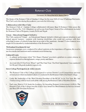 The theme of the Rotaract Club of Hinduja College for the year 2020-21 was #ChallengeTheLimits.