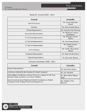 Prize Distribution Convener: . Dr. CA Chandrashekhar Deore Students’ Council 2020 - 2021 Cultural Commi ee 2020 - 2021 2021 - 2022 20 HINDUJA HORIZONS