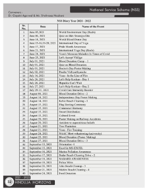 National Service Scheme (NSS) Conveners : Dr. Gayatri Agarwal & Ms. Shehnaaz Nazkani NSS Diary Year 2021 - 2022 2021 - 2022 32 HINDUJA HORIZONS