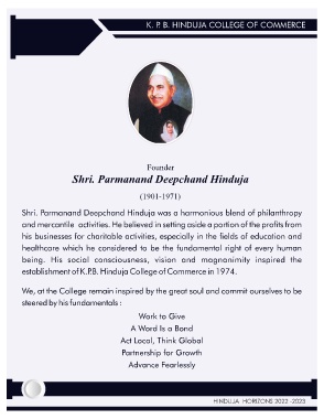 K. P. B. HINDUJA COLLEGE OF COMMERCE Founder Shri. Parmanand Deepchand Hinduja (1901-1971) Work to Give A Word Is a Bond Act Local, Think Global Partnership for Growth Advance Fearlessly HINDUJA HORIZONS 2022 -2023