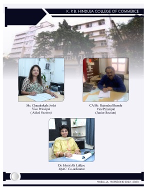 K. P. B. HINDUJA COLLEGE OF COMMERCE Ms. Chandrakala Joshi Vice Principal ( Aided Section) Dr. Ishrat Ali Lalljee IQAC Co-ordinator HINDUJA HORIZONS 2022 -2023